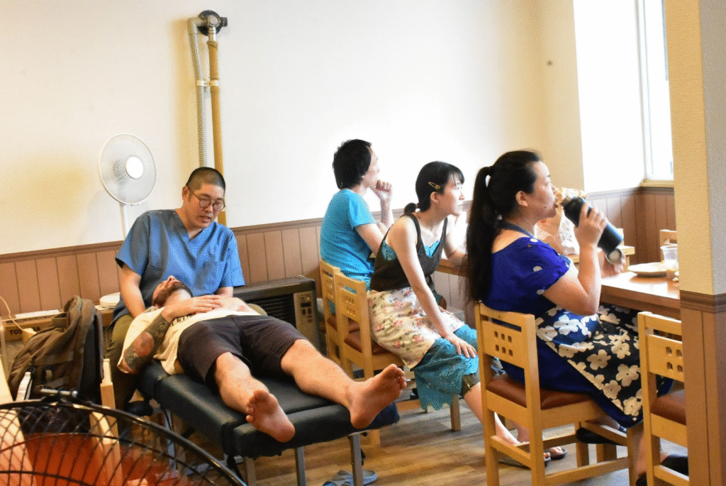 気付くと、通路の真ん中にはどーんと施術用ベッドが設えられ、店員の藤原さんによる整体の提供が始まっています。